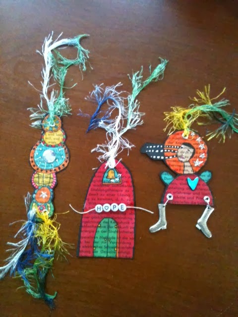 The designs are stamped onto vintage paper and backed with decorative festive paper. A mix of markers, embellishments, and fibers add dimension and shine to these ready-to-hang one-of-a-kind pieces.
